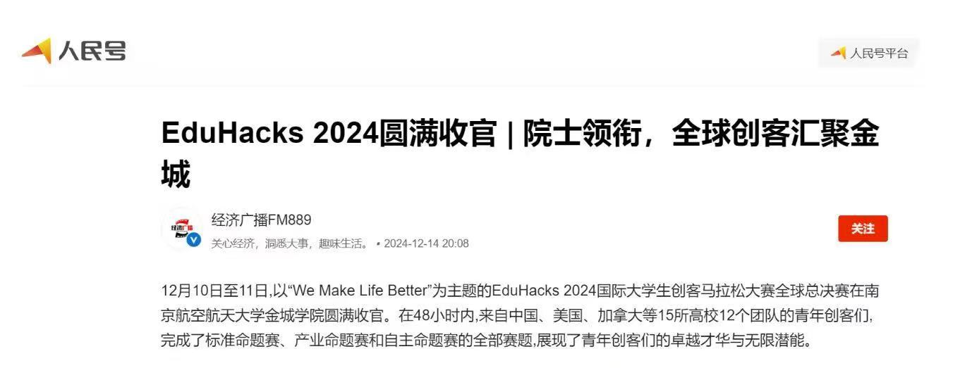 12月10日至11日,以“We Make Life Better"为主题的EduHacks 2024国际大学生创客马拉松大赛全球总决赛在南京航空航天大学金城学院圆满收官。在48小时内,来自中国、美国、加拿大等15所高校12个团队的青年创客们,完成了标准命题赛、产业命题赛和自主命题赛的全部赛题,展现了青年创客们的卓越才华与无限潜能。