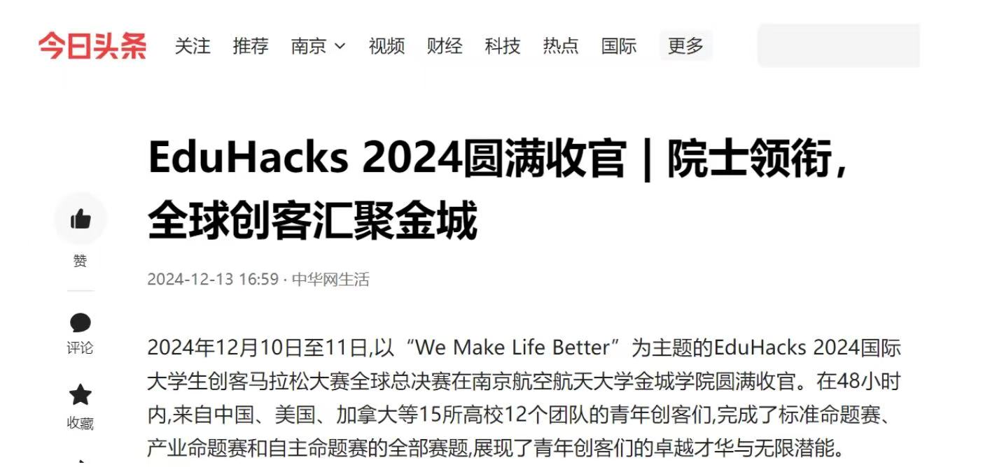 2024年12月10日至11日,以 "We Make Life Better" 主题的EduHacks 2024国际大学生创客马拉松大赛全球总决赛在南京航空航天大学金城学院圆满收官。在48小时内,来自中国、美国、加拿大等15所高校12个团队的青年创客们,完成了标准命题赛、产业命题赛和自主命题赛的全部赛题,展现了青年创客们的卓越才华与无限潜能。