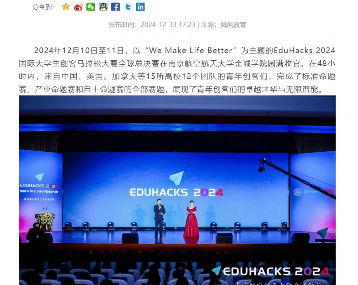 2024年12月10日至11日,以"We Make Life Better" 为主题的EduHacks 2024国际大学生创客马拉松大赛全球总决赛在南京航空航天大学金城学院圆满收官。在48小时内,来自中国、美国、加拿大等15所高校12个团队的青年创客们,完成了标准命题赛、产业命题赛和自主命题赛的全部赛题,展现了青年创客们的卓越才华与无限潜能。