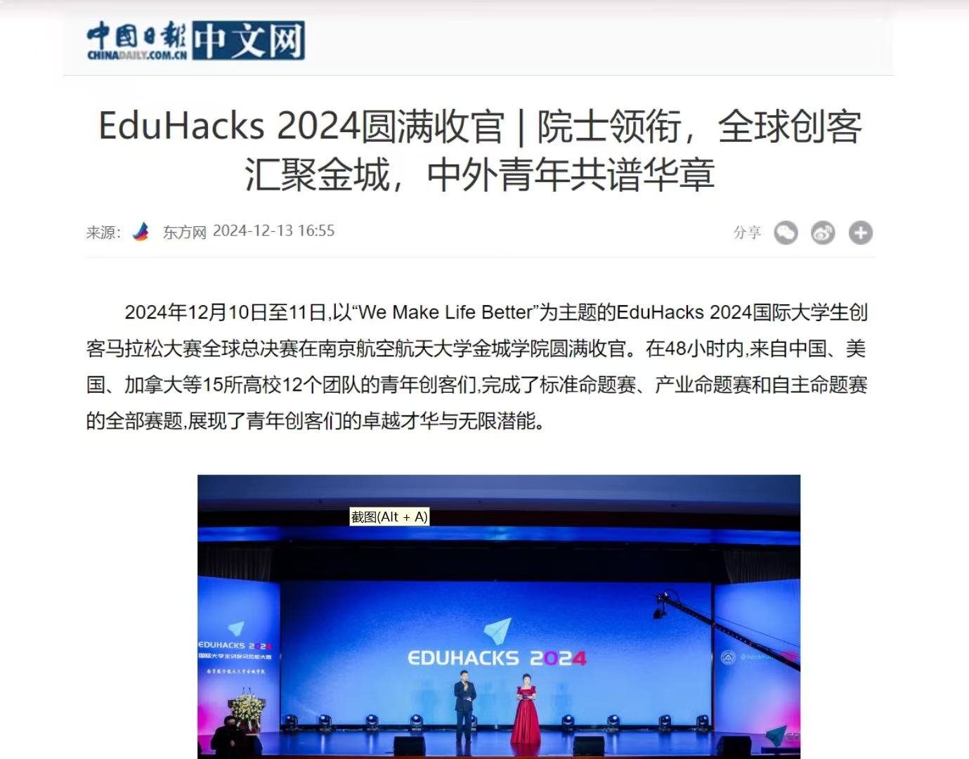 2024年12月10日至11日,以"We Make Life Better"为主题的EduHacks 2024国际大学生创客马拉松大赛全球总决赛在南京航空航天大学金城学院圆满收官。在48小时内,来自中国、美国、加拿大等15所高校12个团队的青年创客们、完成了标准命题赛、业命题赛和自主命题赛的全部赛题,展现了青年创客们的卓越才华与无限潜能。