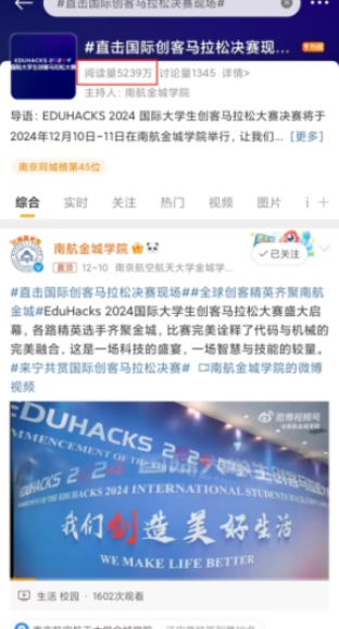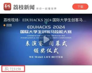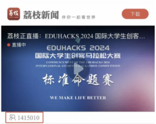 大赛携手江苏广电总台荔枝新闻,特别策划了长达5小时的全球慢直播,是全国高校国际性赛事首次慢直播,全景式展现了选手在标准命题赛中的创意碰撞、激烈角逐与精彩表现。通过网络向全球热爱创新、追求创造的观众实时传递比赛的精彩瞬间,全网观看人数突破141万。大赛闭幕式也通过江苏广电总台荔枝新闻平台进行全球直播,1小时内观看人数突破72万。微博话题#直击国际创客马拉松决赛现场#至今已有5200余万浏览量,冲上了热搜榜第五位。