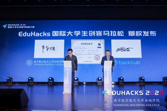 全球总决赛开赛首日,由南航金城学院申报的“EduHacks国际大学生创客马拉松”获得中国版权认证。在闭幕式的舞台上,南航金城学院校长陈旭教授与HackHub联合创始人、CEO 洪研先生共同签署发布,这为 EduHacks 在中国的进一步拓展与深化奠定坚实的基础,也将为众多合作伙伴提供更为可靠、规范的合作框架。
